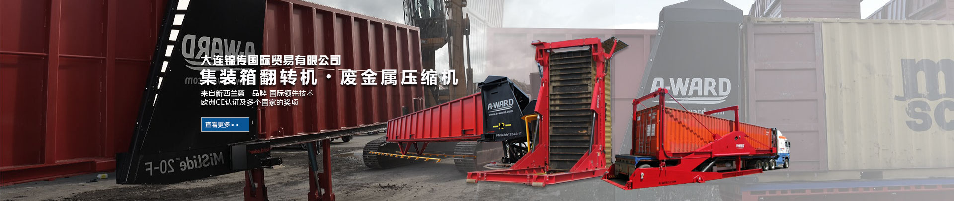 大連錦傳國(guó)際貿(mào)易有限公司于2013年11月與新西蘭A Ward公司達(dá)成戰(zhàn)略合作,成功代理集裝箱翻轉(zhuǎn)機(jī)、廢金屬壓縮機(jī)等產(chǎn)品在中國(guó)大陸的銷售、維護(hù)及保養(yǎng)業(yè)務(wù)。本公司重合同、守信用,保證產(chǎn)品質(zhì)量,以經(jīng)營(yíng)多種特色的產(chǎn)品和薄利多銷的原則,贏得了廣大客戶的信任與厚愛(ài)。現(xiàn)長(zhǎng)期出口產(chǎn)品至澳大利亞,巴西,德國(guó),俄羅斯,哥倫比亞,美國(guó),泰國(guó),羅馬尼亞,新西蘭 ,意大利,越南,印度,印度尼西亞等國(guó)家。